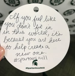 For me, last week was the salve I needed to heal my wounded Spartan soul. I’m honored to have witnessed firsthand what difference a little kindness can make. As students read their messages aloud I thought, “Yes! This is who we are! This is who can be!” We are Spartans. We are strong. We are kind. We all have a little hope and good will that someone else needs. Find a way to share yours. #SpartansWill.