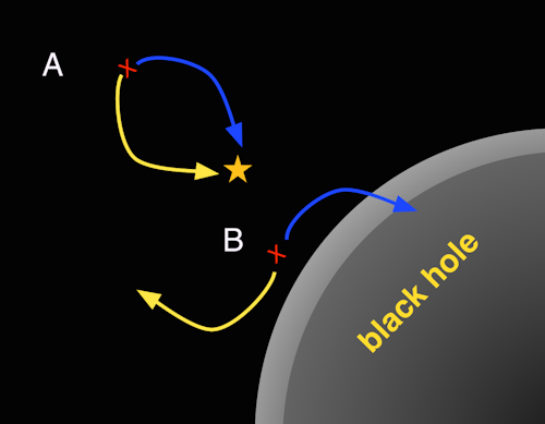A pair of photons that annihilate each other is labeled A. In a second pair of photons, labeled B, one enters the black hole while the other heads outward, setting up an energy debt that is paid by the black hole. Christoph Adami, CC BY-ND