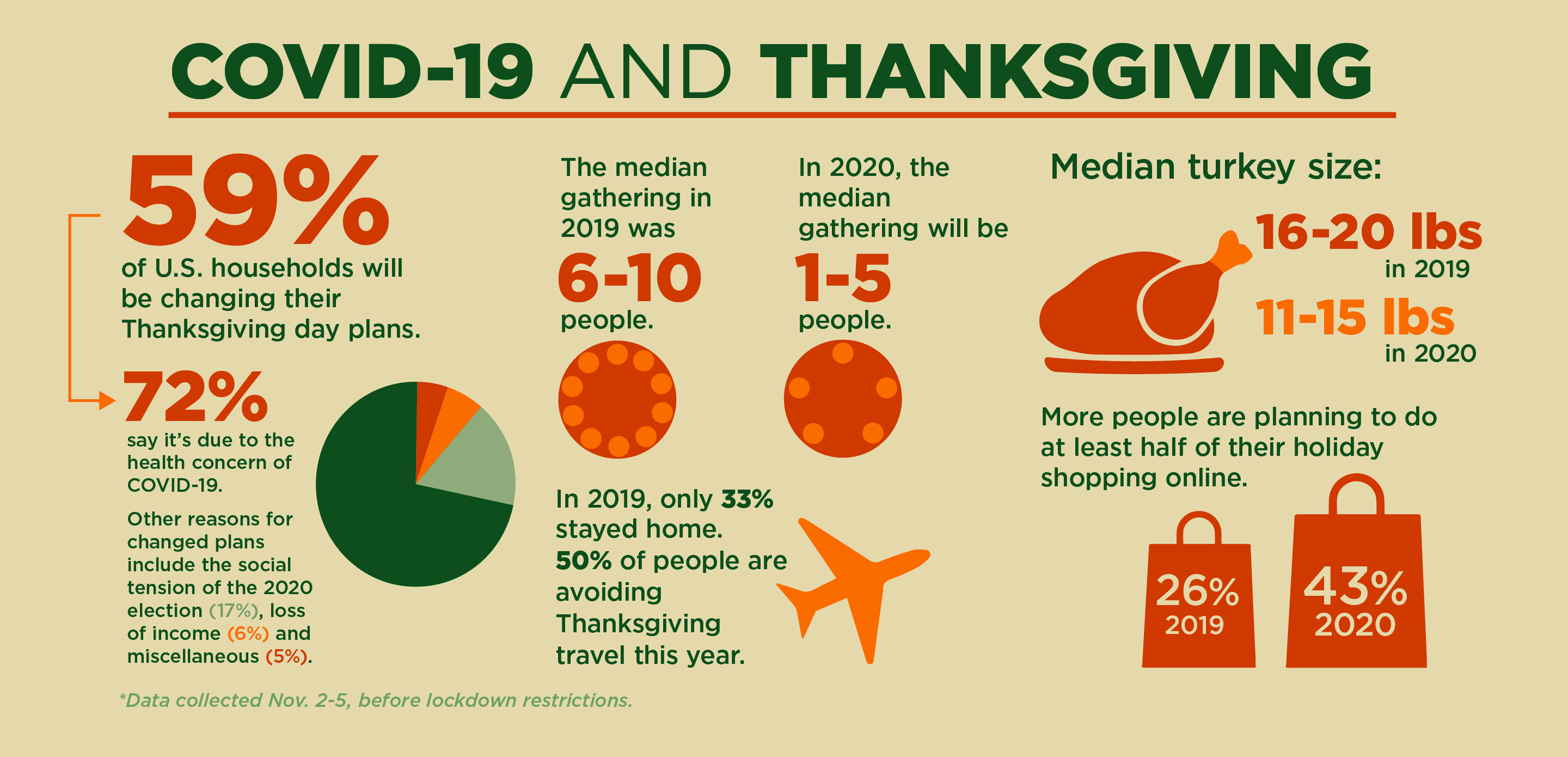New data from Michigan State University predicts that Thanksgiving celebrations could be down approximately 59% this year, with 72% of those limiting their plans doing so because of COVID-19.