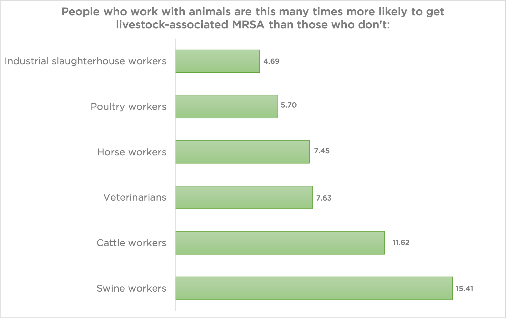 To calculate the risk levels of acquiring livestock-associated MRSA, Wu and Chen combed through 15 years of published literature, extracting data about the likelihood of people acquiring the bacteria based on their livestock-related profession. The risk was elevated for every occupation they studied: vets, slaughterhouse employees and people who worked with swine, horses, cattle and poultry.