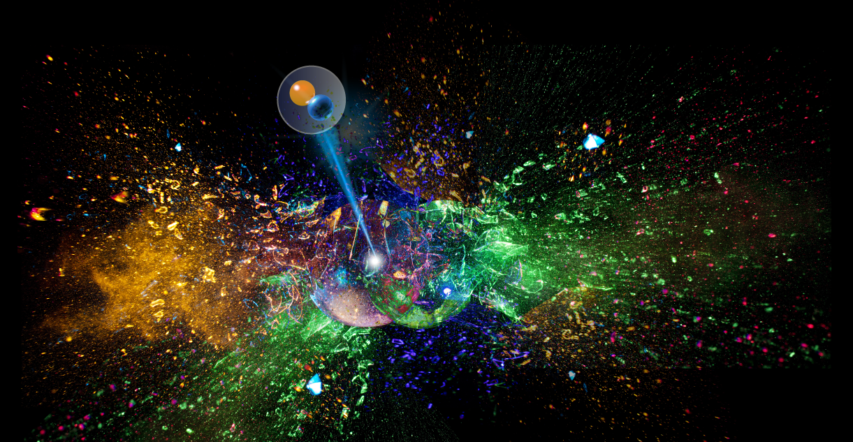 An animation from an actual calculation shows two orbs, which represent tin nuclei, collide and explode into red, blue and green dots which represent protons, neutrons and the elusive pions, respectively. Credit: Yong Jia Wang, Huzhou University, China