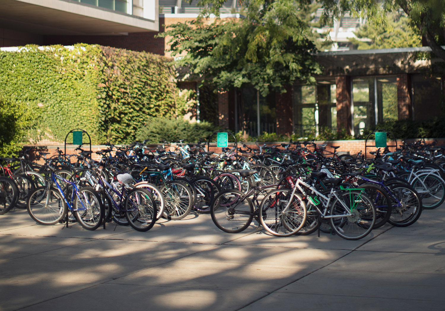 Bicycling across campus remains one of the most popular and efficient methods of getting around. Bicycles parked outside Wells Hall.