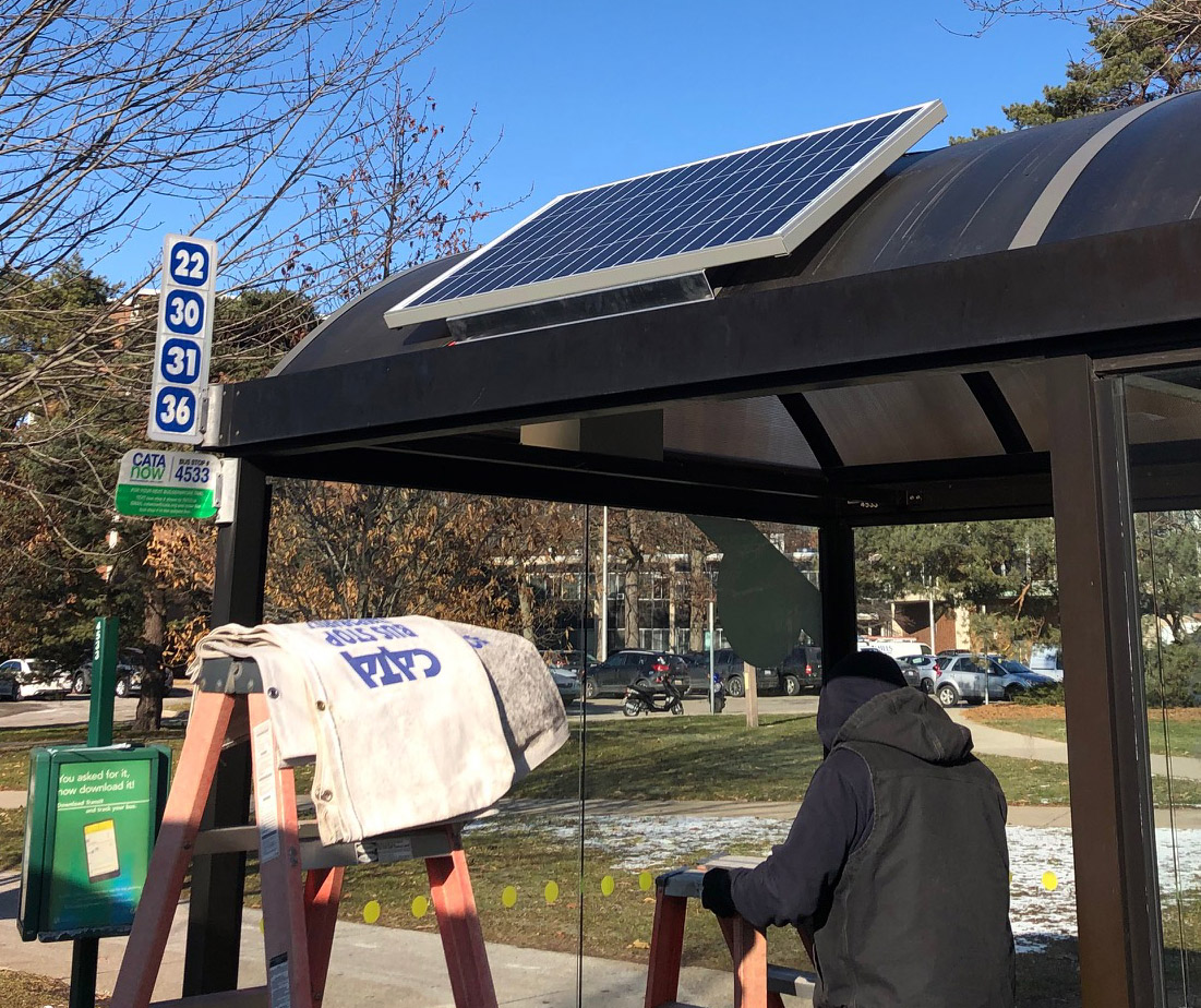 Solar-powered lighting at a CATA bus stop on MSU's campus.