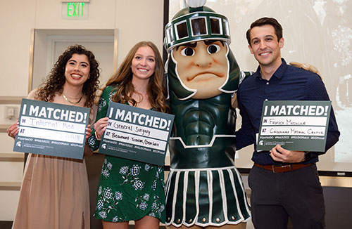 The graduating students of the MSU College of Osteopathic Medicine achieved an impressive 98% match rate. Military students achieved a 100% match rate (five placements within the military, and one placement through the NRMP).
