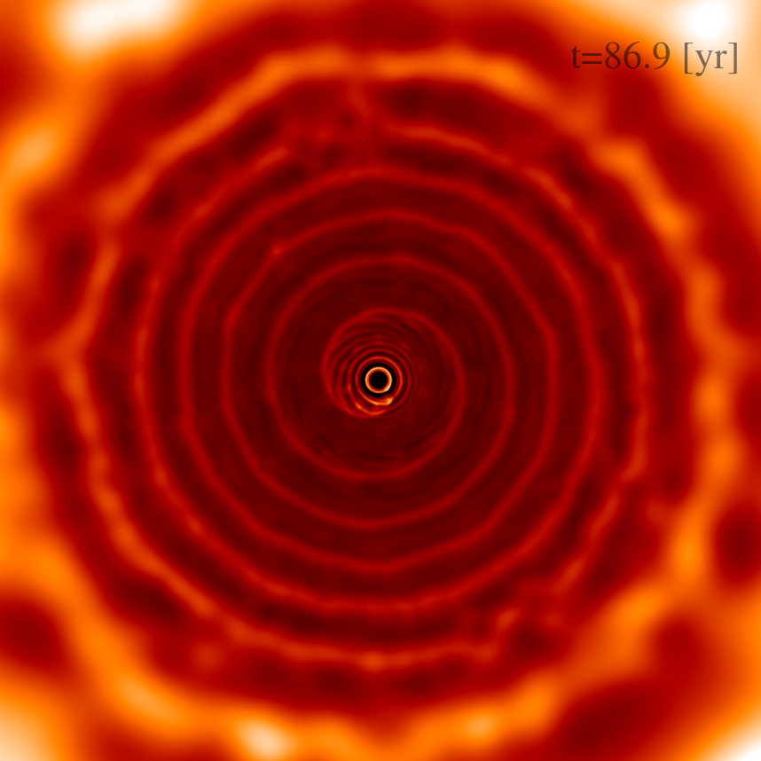 For example, if the planet circles the star once in exactly the time it takes the star to pulsate twice, two bar-like structures grow through the gas and dust cloud. But if that ratio isn’t exactly 2-to-1, the bars start to curve and create a two-armed spiral instead. If the ratio is closer to 3-to-1 — again, without being exact — the spiral gets a third arm.