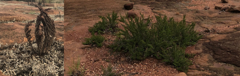 Resurrection plants go from dehydrated on the left to hydrated on the right. Image courtesy of Rose Marks