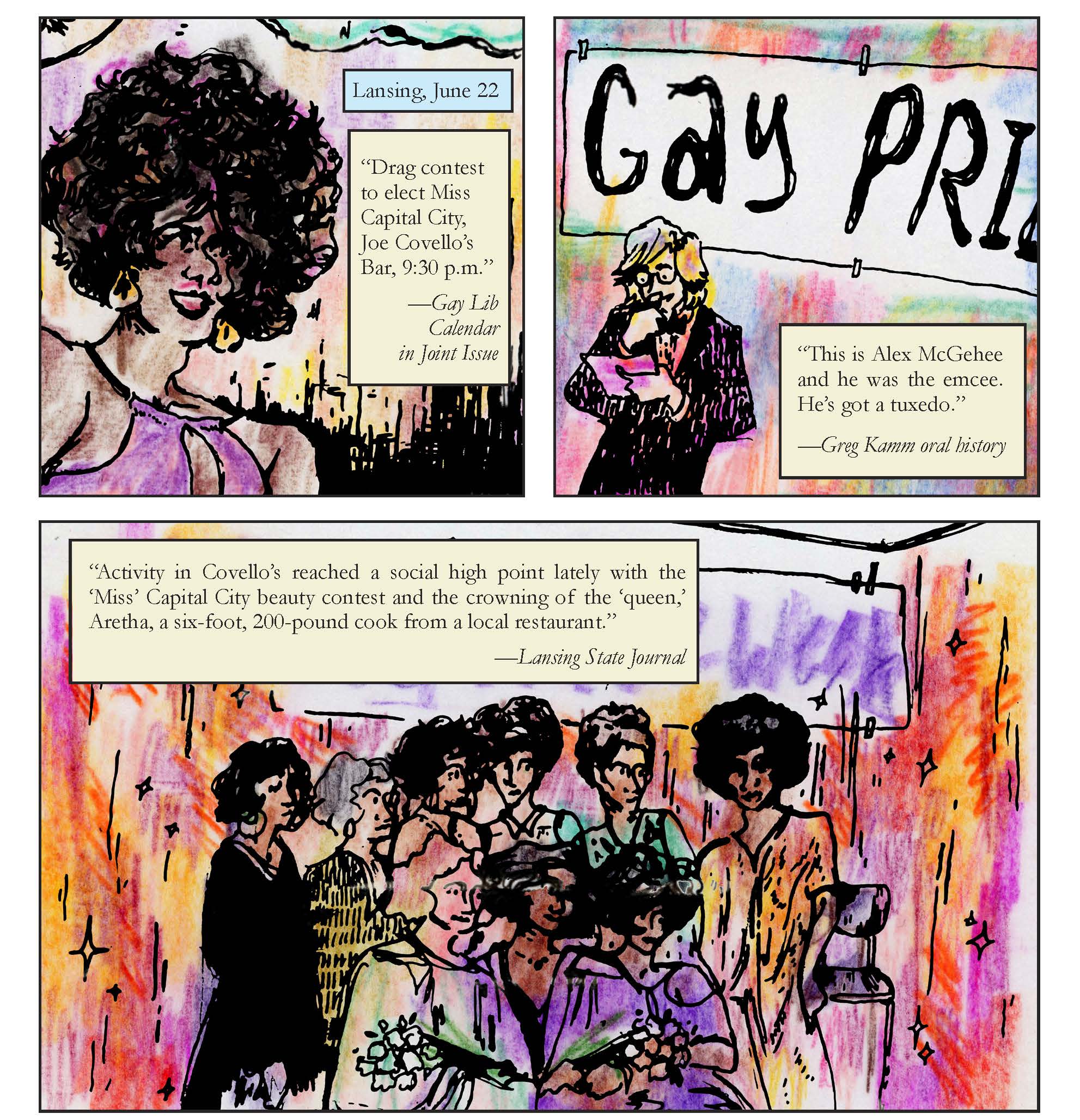 Scott had won the Miss Capital City contest at Joe Covello’s bar, a mainstay in Lansing’s gay community, sponsored by the MSU Gay Liberation Movement. GLM is one of the oldest lesbian, gay, bisexual and transgender groups in Michigan, founded in the early 1970s. Scott rode on the hood of a car at the very front of the march and performed at the dance. During this time, Scott worked at a restaurant in Lansing and later went on to work as a chef in the Shaw Hall cafeteria on campus.