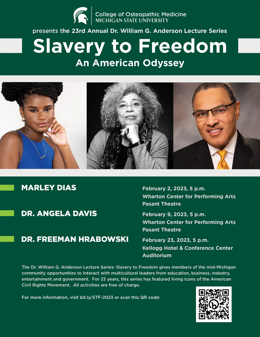 The 23rd annual Dr. William G. Anderson Lecture Series, Slavery to Freedom: An American Odyssey has added community engagement opportunities to this year’s series, which is focused on the history and legacy of African Americans in the U.S. Named in honor of William G. Anderson, D.O., the series honors his legacy as a trailblazer in the Civil Rights Movement, as the first African American member and president of the American Osteopathic Association Board of Trustees, and contributions to the MSU College of Osteopathic Medicine, the lecture series is designed to be a campus and community conversation.