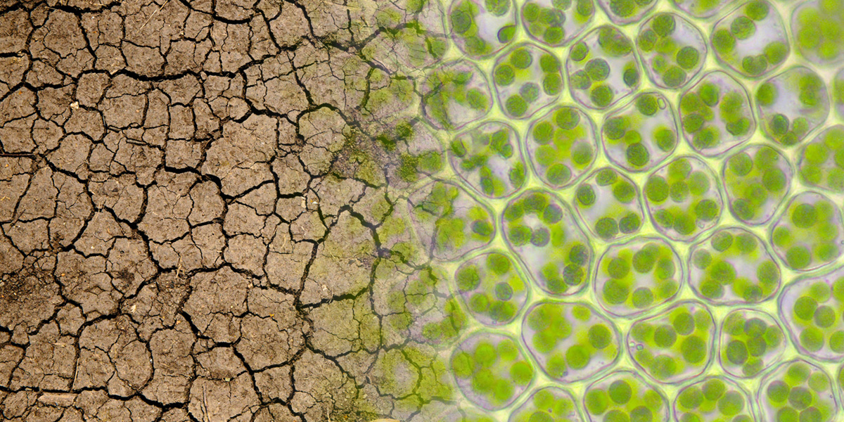 Michigan State University researchers may have found a link between climate change and plant nutrition. Credit: Hermann Schachner via Wikimedia Commons (plant cells)/Mike Erskine via Unsplash (arid land)