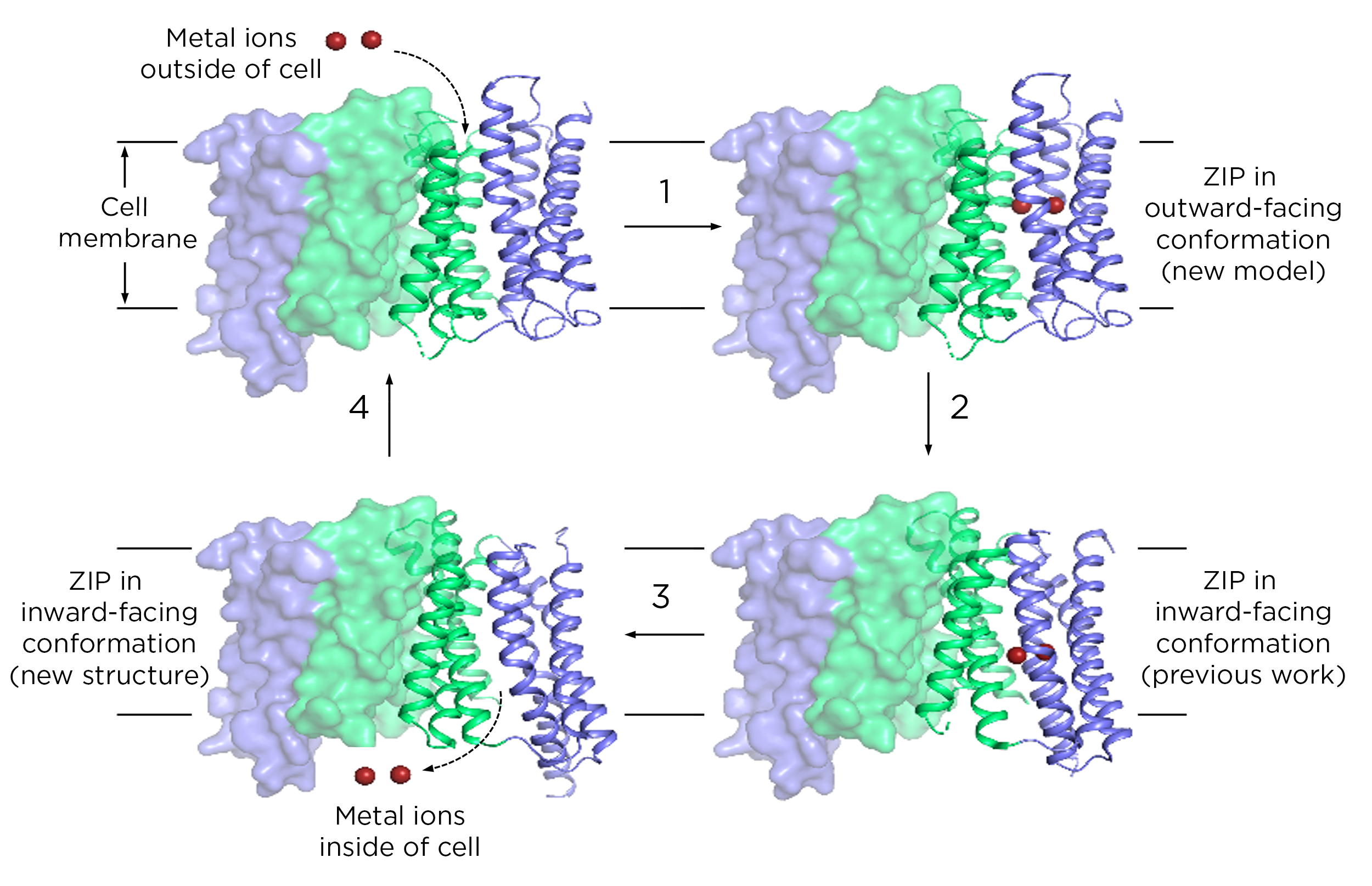 What the team found was that ZIPs have internal structures that move up and down to transport metals.