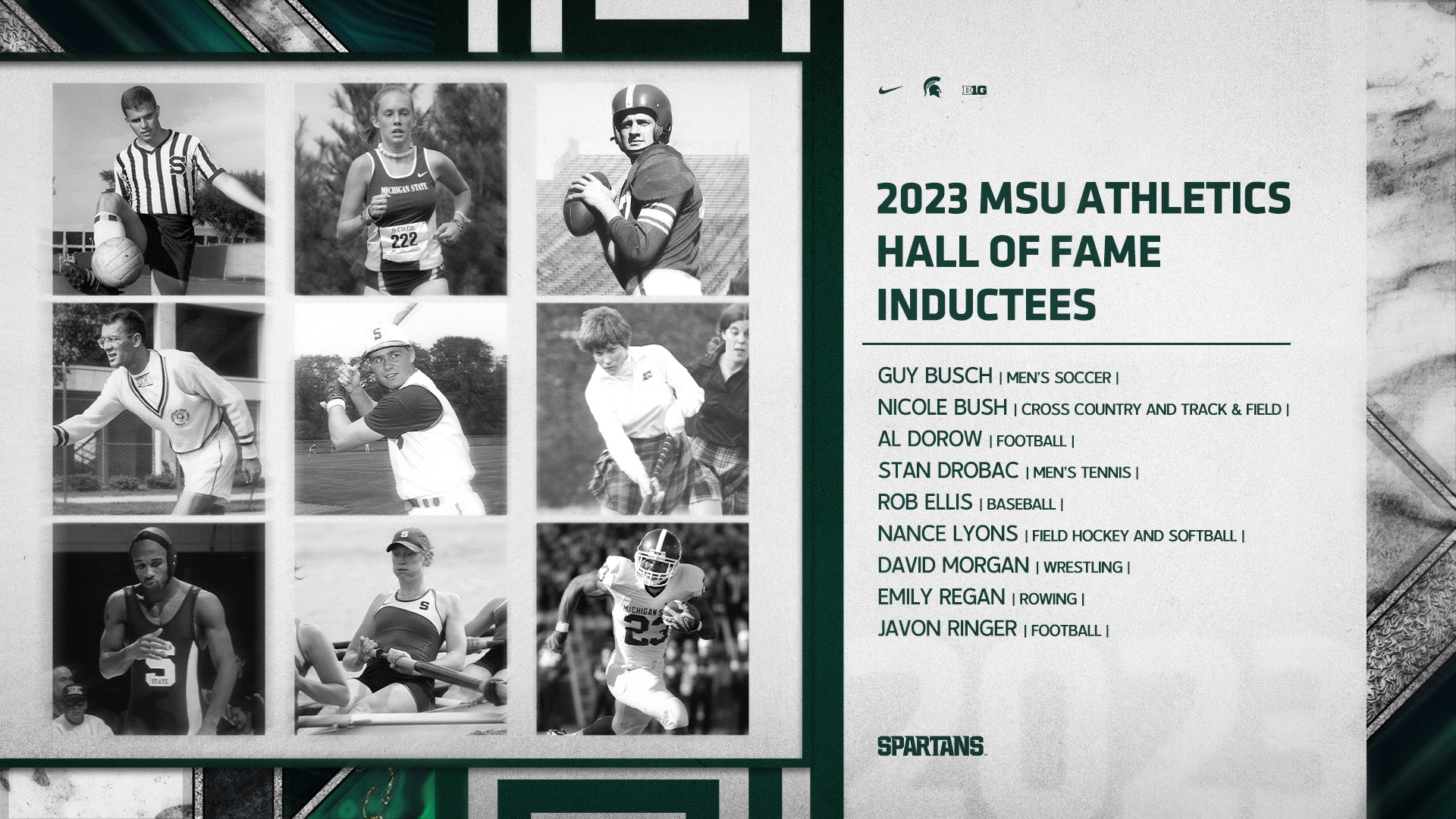 Michigan State will induct nine Spartans into its Athletics Hall of Fame on Friday, Sept. 15, as part of its annual "Celebrate" weekend. The 2023 Hall of Fame Class includes: Guy Busch (men's soccer), Nicole Bush (women's cross country/track & field), Al Dorow (football), Stan Drobac (men's tennis), Rob Ellis (baseball), Nance Lyons Hall (field hockey/softball), David Morgan (wrestling), Emily Regan (rowing) and Javon Ringer (football).