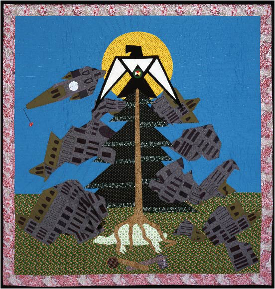 “The Tree of Peace Saves the Earth” is from the MSU Museum’s collection, created by Alice Olsen Williams in 1990, an Anishinaabe/Norwegian member of Curve Lake First Nation in Ontario, Canada. Inspired by a land dispute in Quebec involving indigenous grave sites and sovereign land, Williams crafted this quilt to raise awareness and educate others about this pressing issue. The quilt employs powerful symbolism to convey the story it represents.