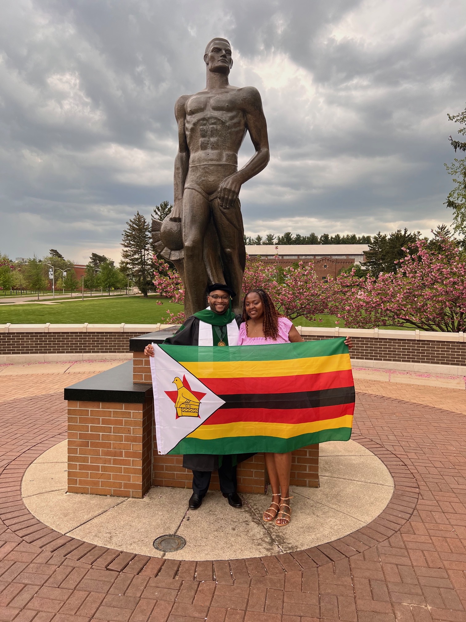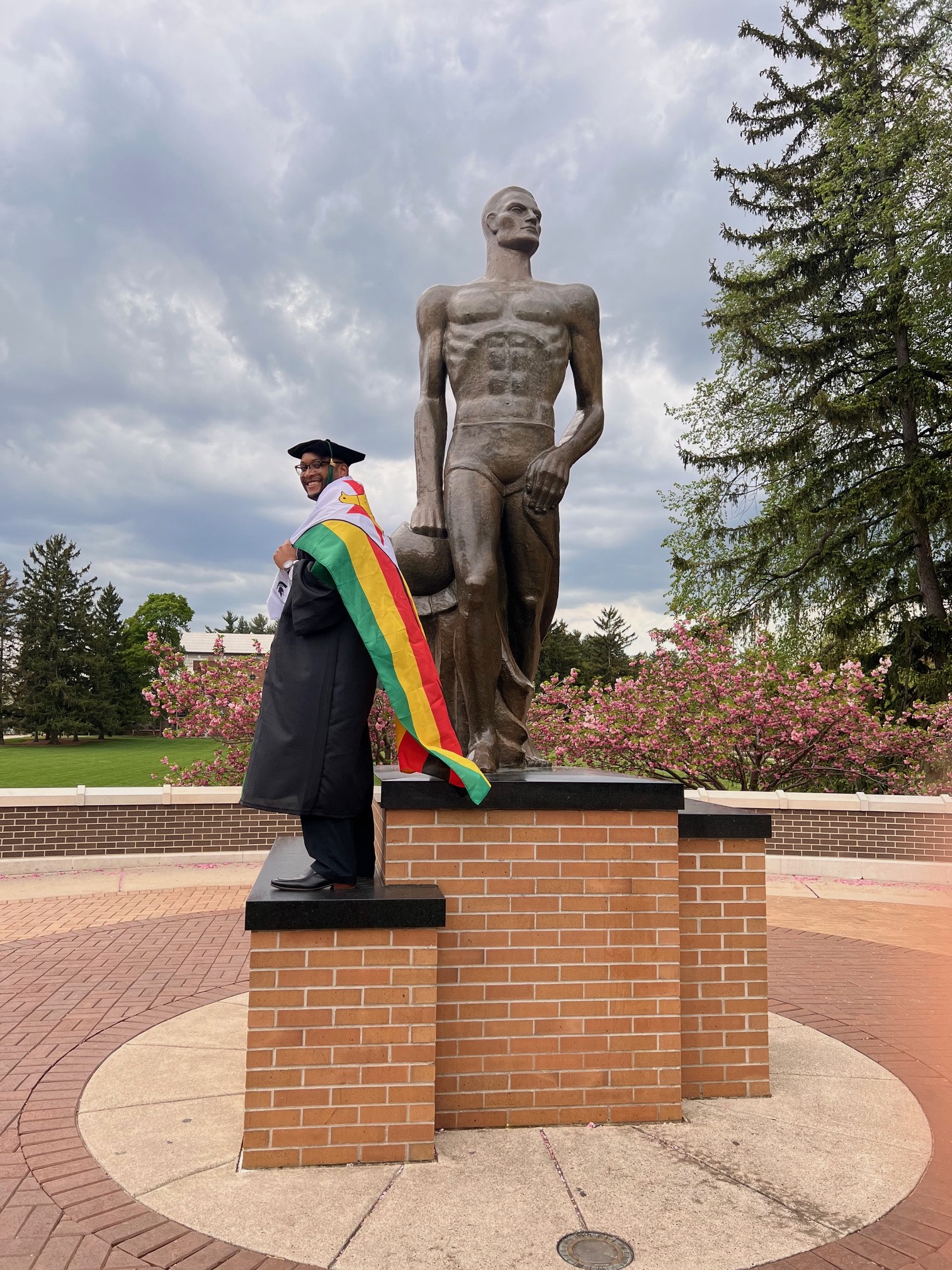 Following our mother’s untimely passing, my family migrated to the USA, where we discovered a new home in East Lansing and were embraced by MSU. I recall exploring the myriad of winding trails on campus, often leading to buildings steeped in history. For my sister and I, these paths became our way of honoring our mother's memory and exploring our newfound abode. During these walks, I often observed students and visitors capturing moments next to The Spartan, their excitement and the flood of emotions tangible even to bystanders nearby. Oblivious to the elation experienced by those graduating beside the statue, my sister once softly whispered in my ear, "One day, you will have your photograph taken here." Those words reverberated within me, motivating me to set lofty goals in all my academic pursuits.