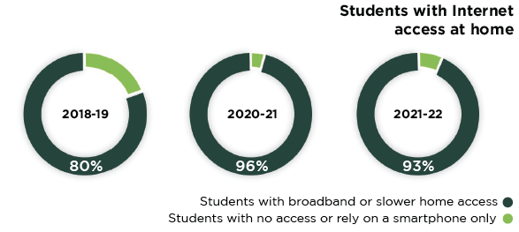 The study found that the number of students who currently have home internet access is lower than it was at the height of the pandemic. In the 2020-21 school year, 95.6% of students reported that they had internet access at home, compared to 93.2% of students in 2022.