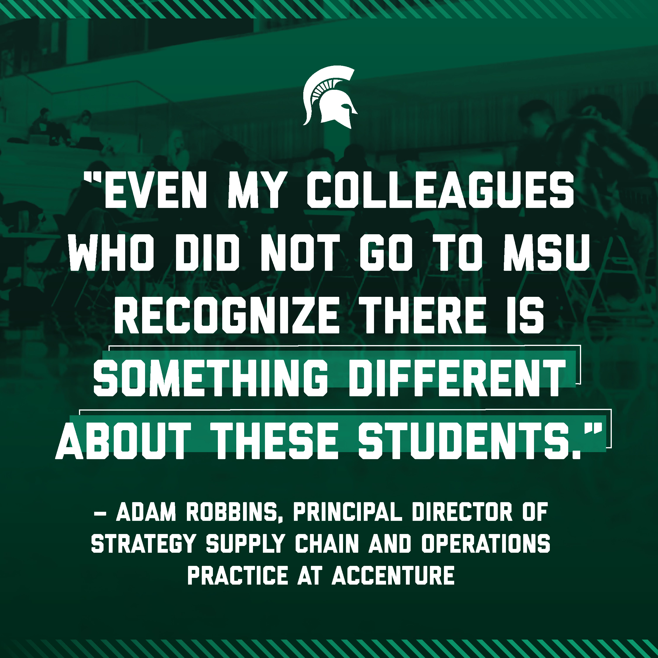“The classes are practical, not just theory, so we learn how to actively think and solve problems. Plus, the professors have real-world experience to share,” says Peter Estefan, a fourth-year student in supply chain management and president of the Supply Chain Management Association, one of the largest student organizations at MSU.