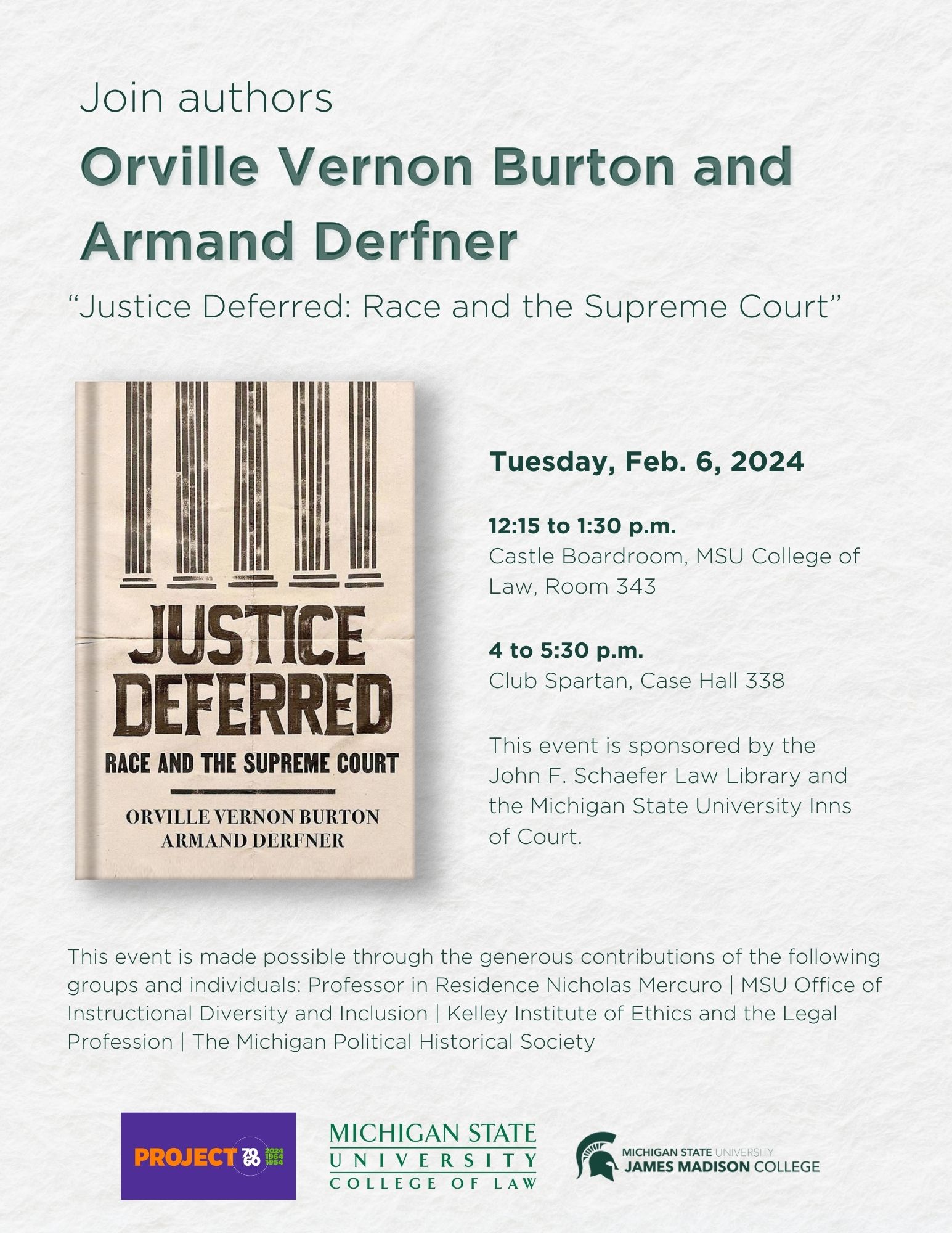 Sponsored by the John F. Schaefer Law Library and the Michigan State University Inns of Court, on Feb. 6, both Burton and Derfner will be visiting campus and meeting with students at the MSU College of Law and at James Madison College. All are welcome.