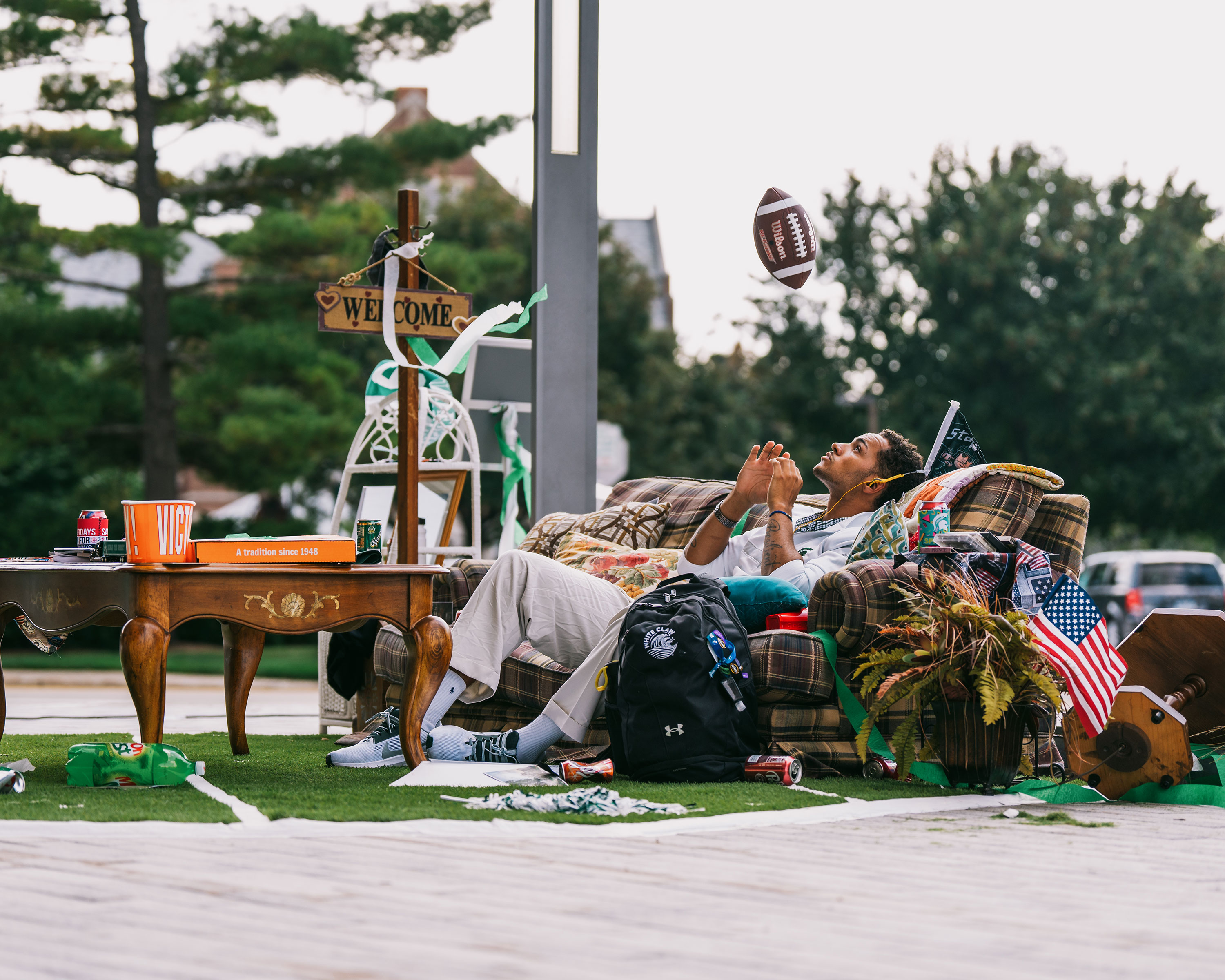 In the fall, mike durkin, a visiting artist-in-residence with the MSU Department of Theatre, collaborated with the MSU Broad Art Museum on a performance installation during homecoming weekend titled “And those Spartans Play Good Ball.” The installation, designed to resemble a tailgate, was created by students in the Department of Theatre, who also acted out roles of people you might see at a tailgate: someone supervising the grill, someone watching TV, a group of people playing yard games.