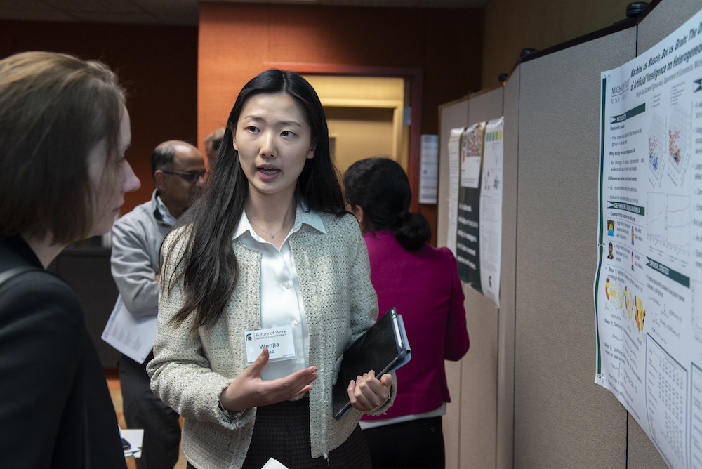 Faculty from across MSU colleges and representatives from community organizations came together to collaborate and engage on this subject. Expert-led interactive discussions centered on four topics, including human interaction with artificial intelligence, accessibility changes to technology, new skills in the labor market and government engagement. Additionally, graduate students presented their research on the future of work.
