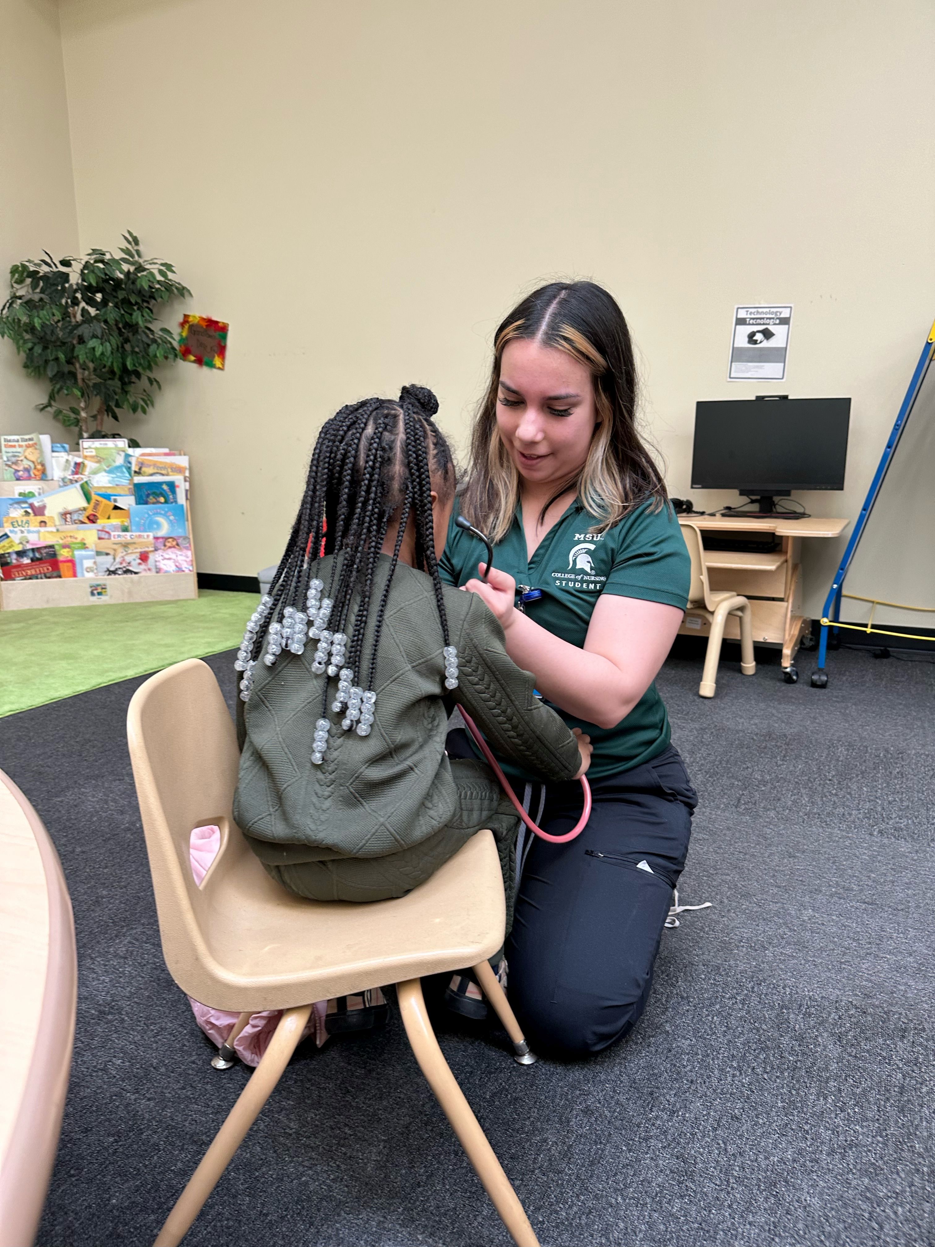 Amid the happy hubbub of a preschool classroom after recess, MSU nursing student Lexie Salazar leans in with a stethoscope to listen to a 4-year-old’s lung sounds.