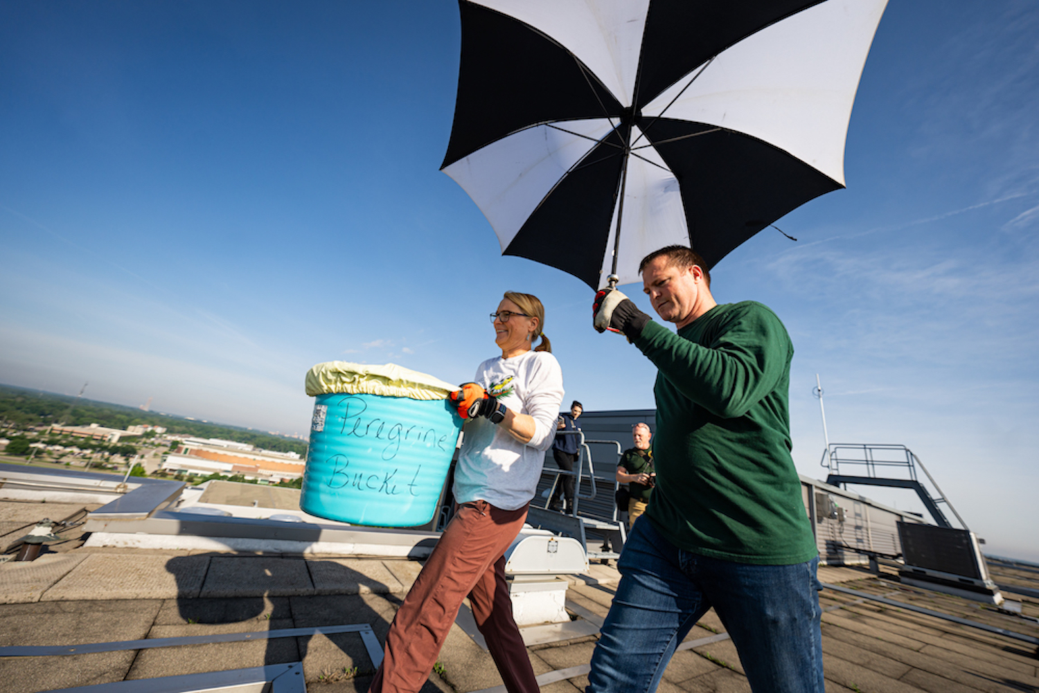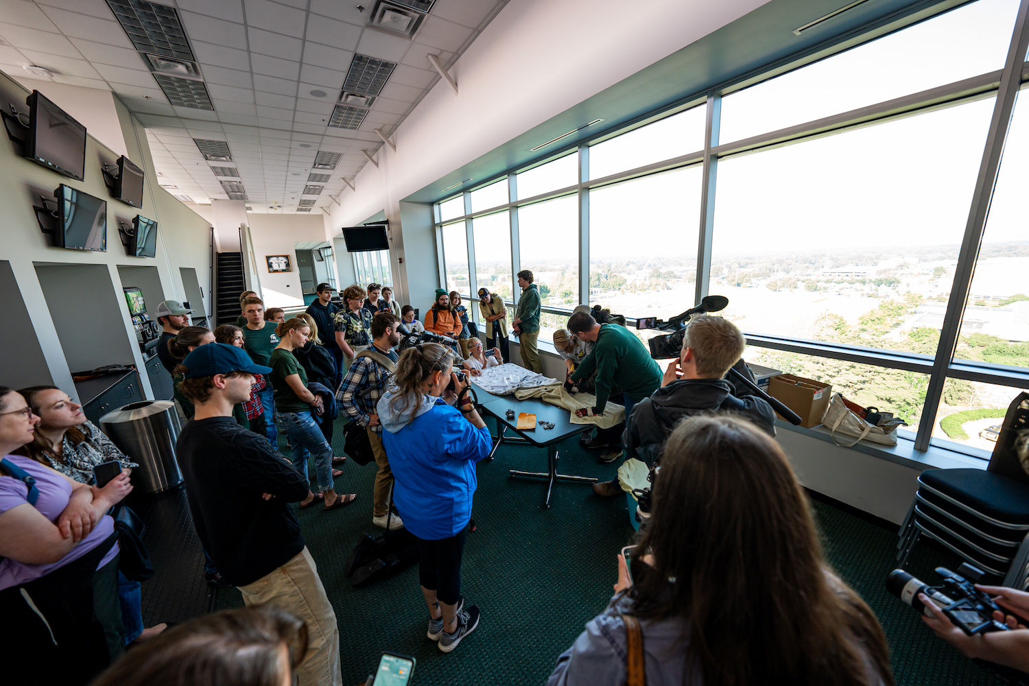 The process involved researchers, wearing hard hats and holding umbrellas for protection, first carefully removing the falcon chicks from their nest on the top of the stadium. Because falcons will defend against anyone who invades their nest, it is paramount the team work swiftly and safely. Then, when the chicks were settled inside, the team was able to attach the bands quickly, with some squirming from the chicks. They were then returned to their nest.