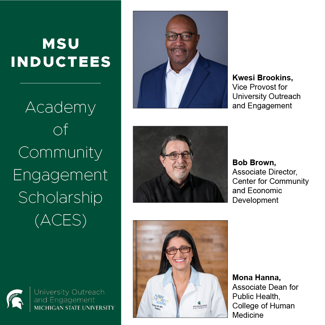 The inductees—Kwesi Brookins, vice provost for University Outreach and Engagement and professor of psychology; Bob Brown, associate director of the MSU Center for Community and Economic Development; and Mona Hanna, a C.S. Mott Endowed Professor of Public Health—were nominated by their peers.