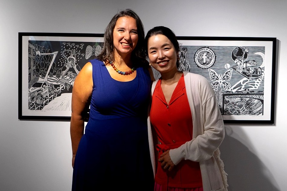 “One of the core principles of our project is that accessibility is a process — part of production from the very start — and not just an end product to meet ADA compliance,” said Soohyun Cho, who co-curated the MSU exhibitions. “In our commitment to making this exhibition as accessible as possible, we offer multimodal access to artwork and stories, extending beyond the traditional modes of engagement. For instance, visitors are invited to explore the linoleum print artwork, titled “COVID Chronicles,” by Ellen Shattuck Pierce, in multiple ways: flipping through the original artbook, touching the tactile graphics version, and listening to audio recordings of image descriptions linked via QR code. At the heart of this practice is the inclusion of blind and low-vision individuals, as well as anyone who appreciates diverse aesthetic experience.”