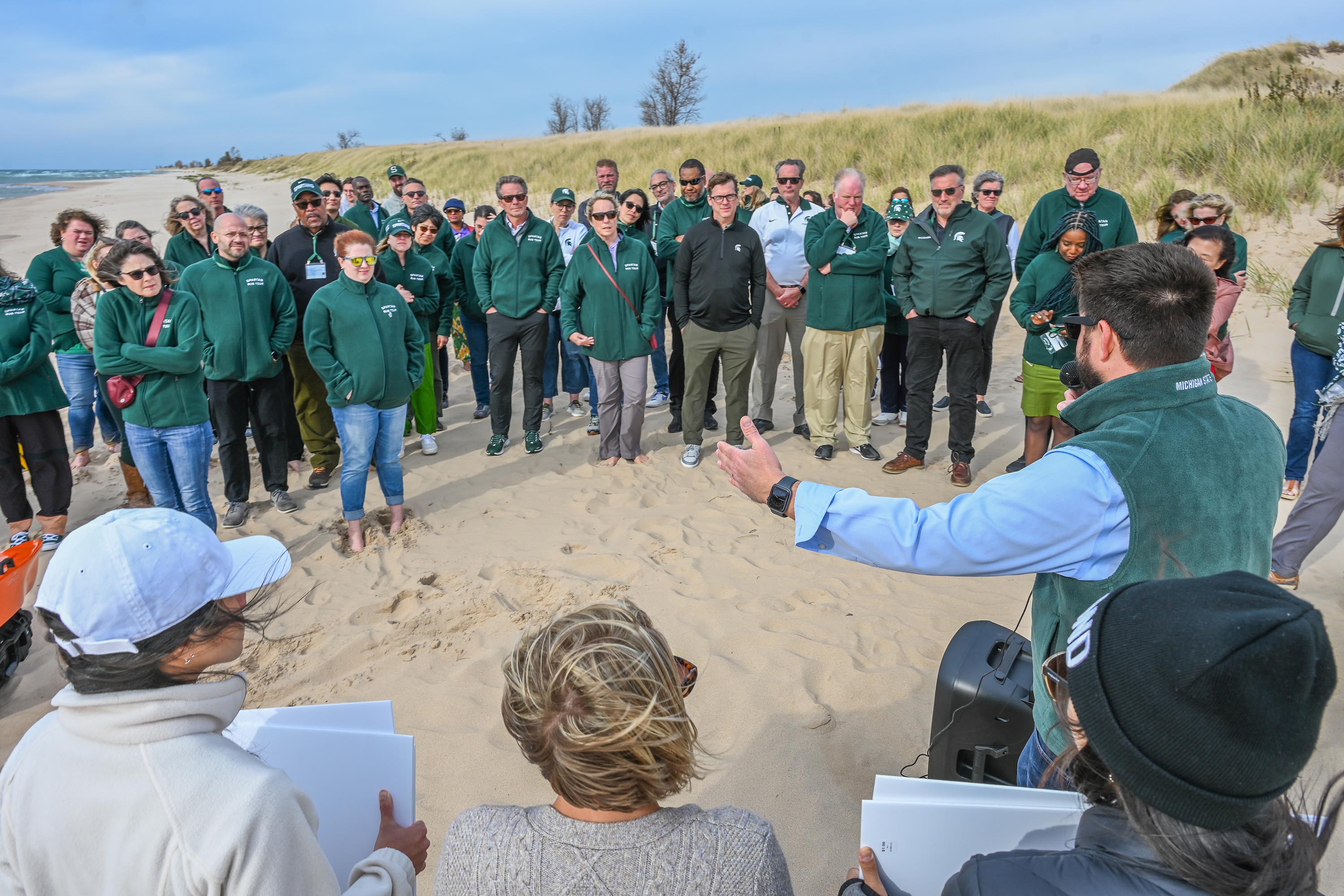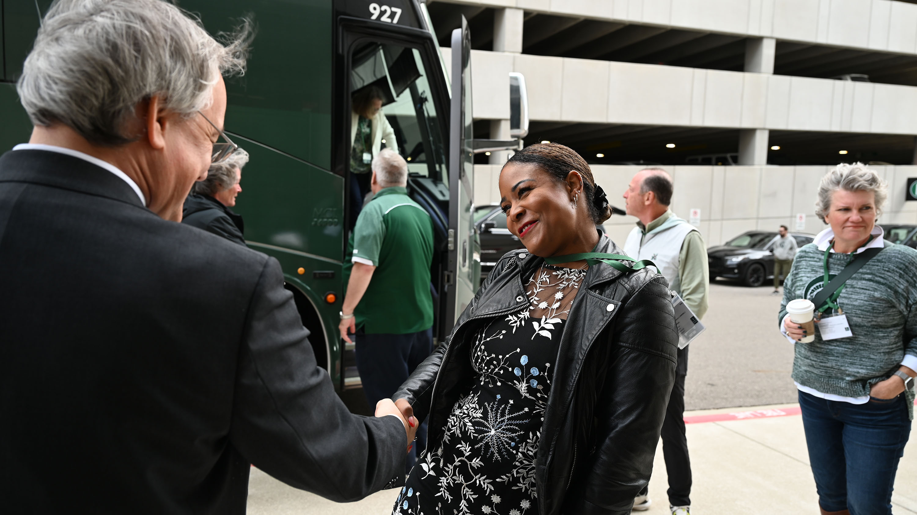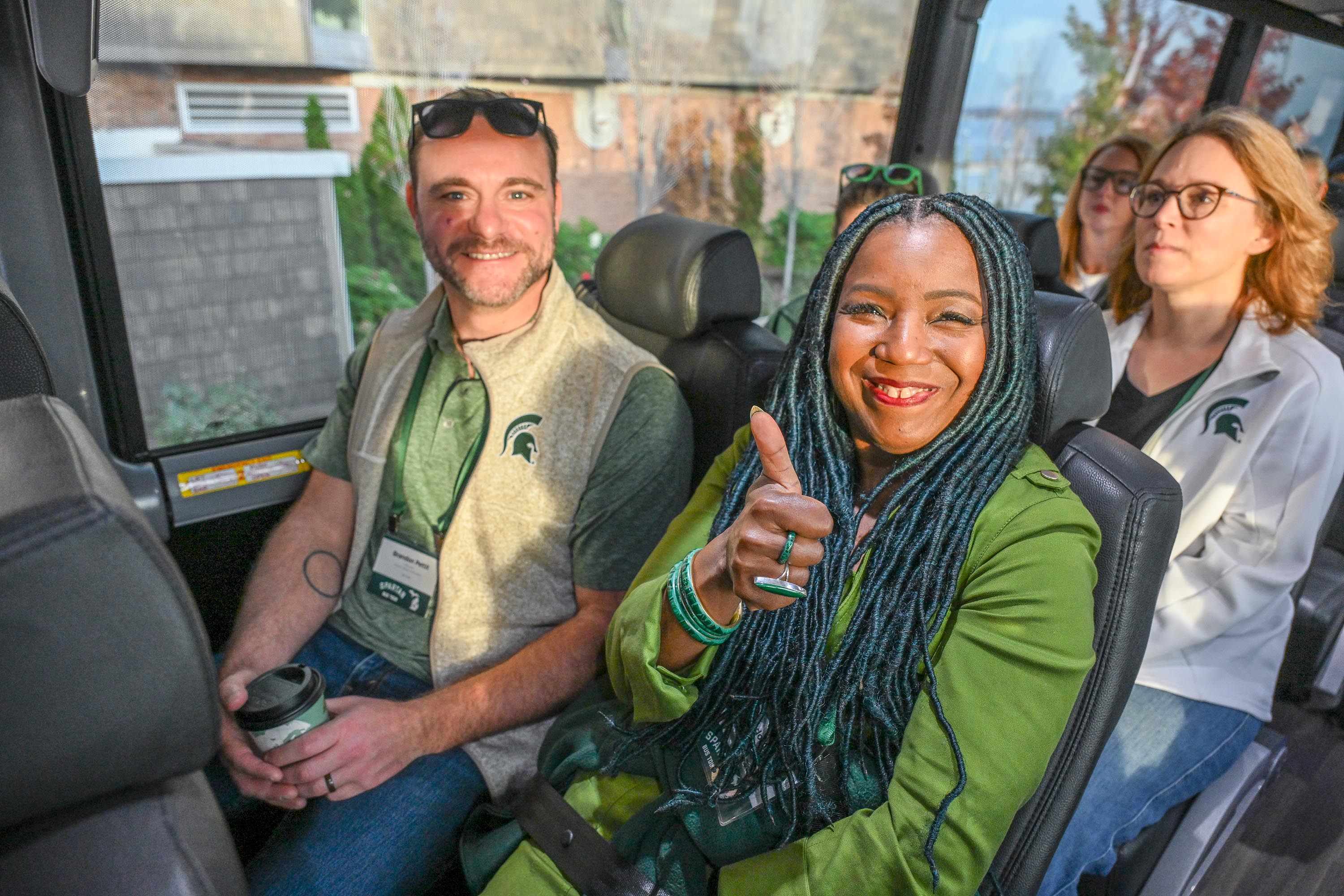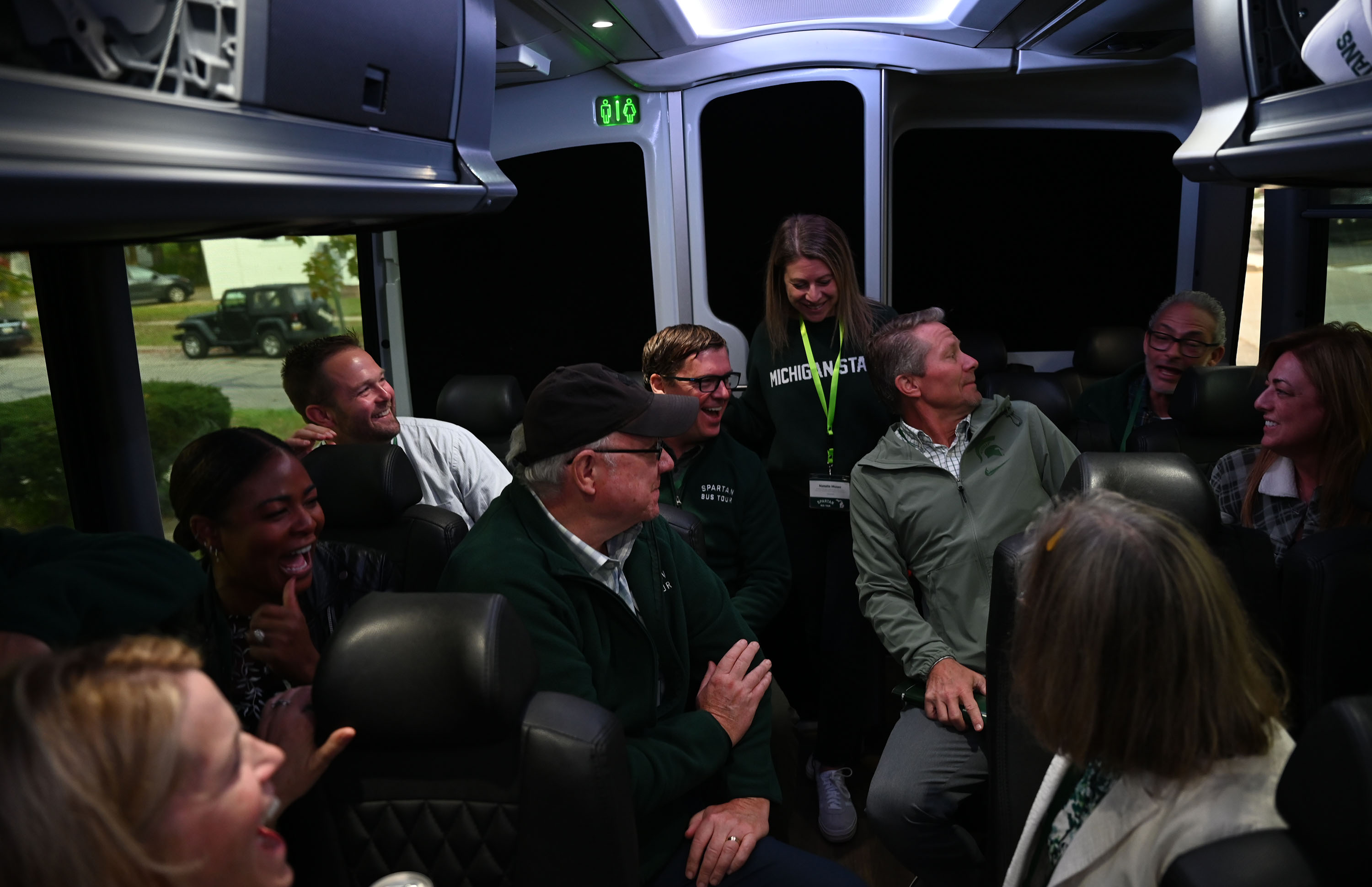On Oct. 21, a group of 60 MSU faculty and administrators boarded a green and white bus to travel across the western Lower Peninsula and learn about MSU’s far-reaching impact in Michigan.
