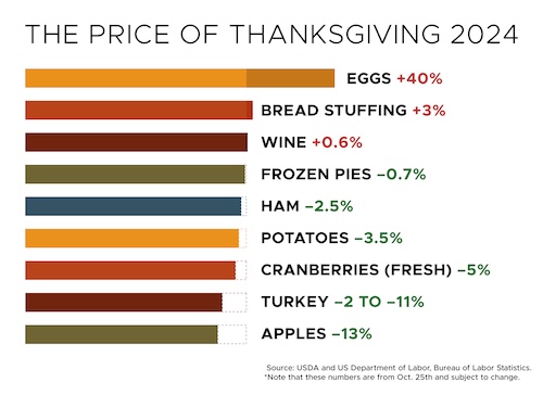 Fresh produce could also be a bright spot at the register. We can expect lower prices on seasonal items like apples, cranberries and potatoes. Some holiday staples, however, will likely cost a bit more. Eggs remain affected by bird flu issues, and peas and stuffing ingredients might see slight increases.