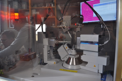 “There’s good reason why we use the DAC for the X-ray diffraction part of this study,” Dorfman explained. “It’s so small — smaller than a coffee cup. You can fit them inside the excellent diffractometer Weiwei brought to MSU, and you can see through diamonds, so you have a window into the experiment while it happens.”