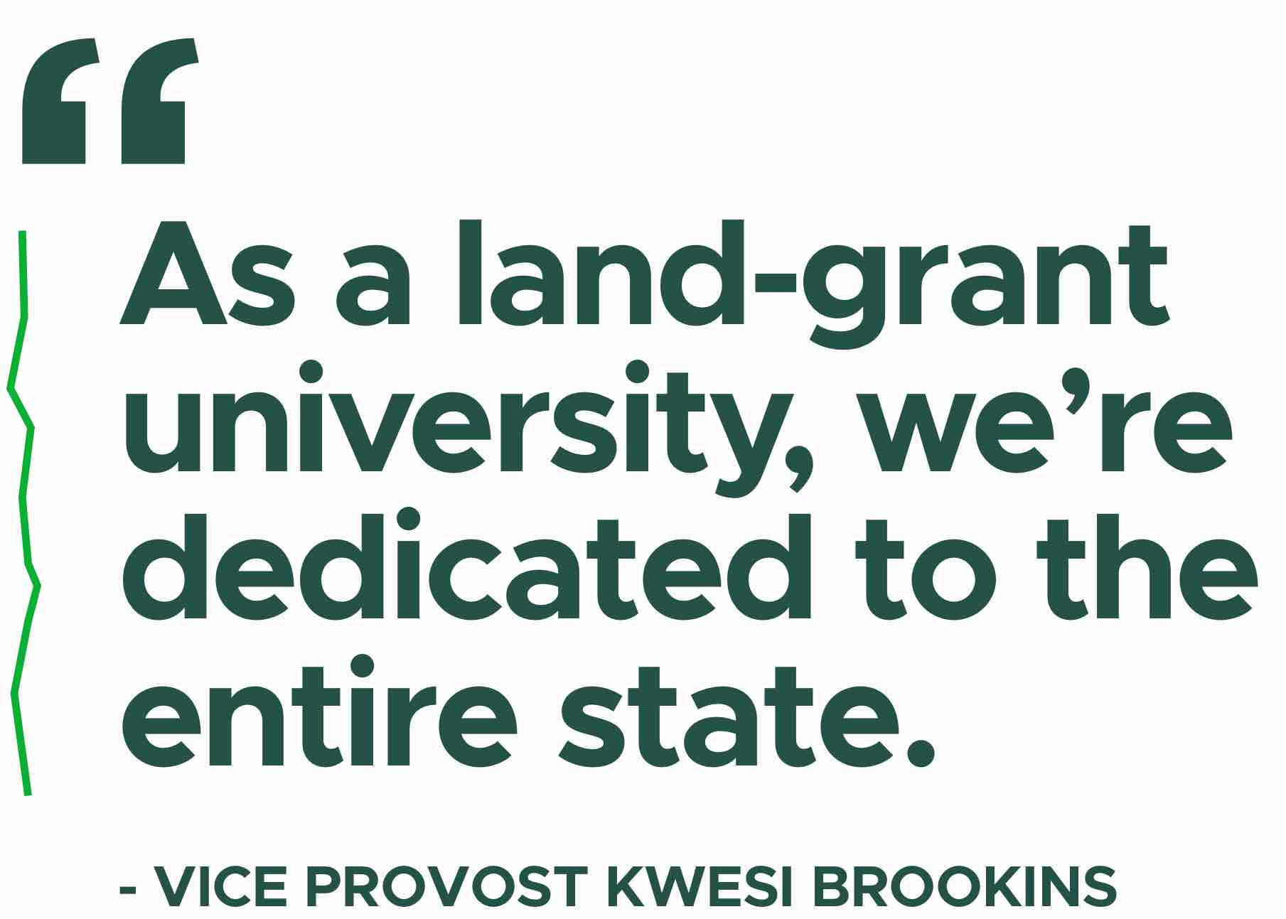“As a land-grant university, we’re dedicated to the entire state,” Brookins says. “Working with many underrepresented communities, our commitment is to provide the necessary resources and support to drive progress.”