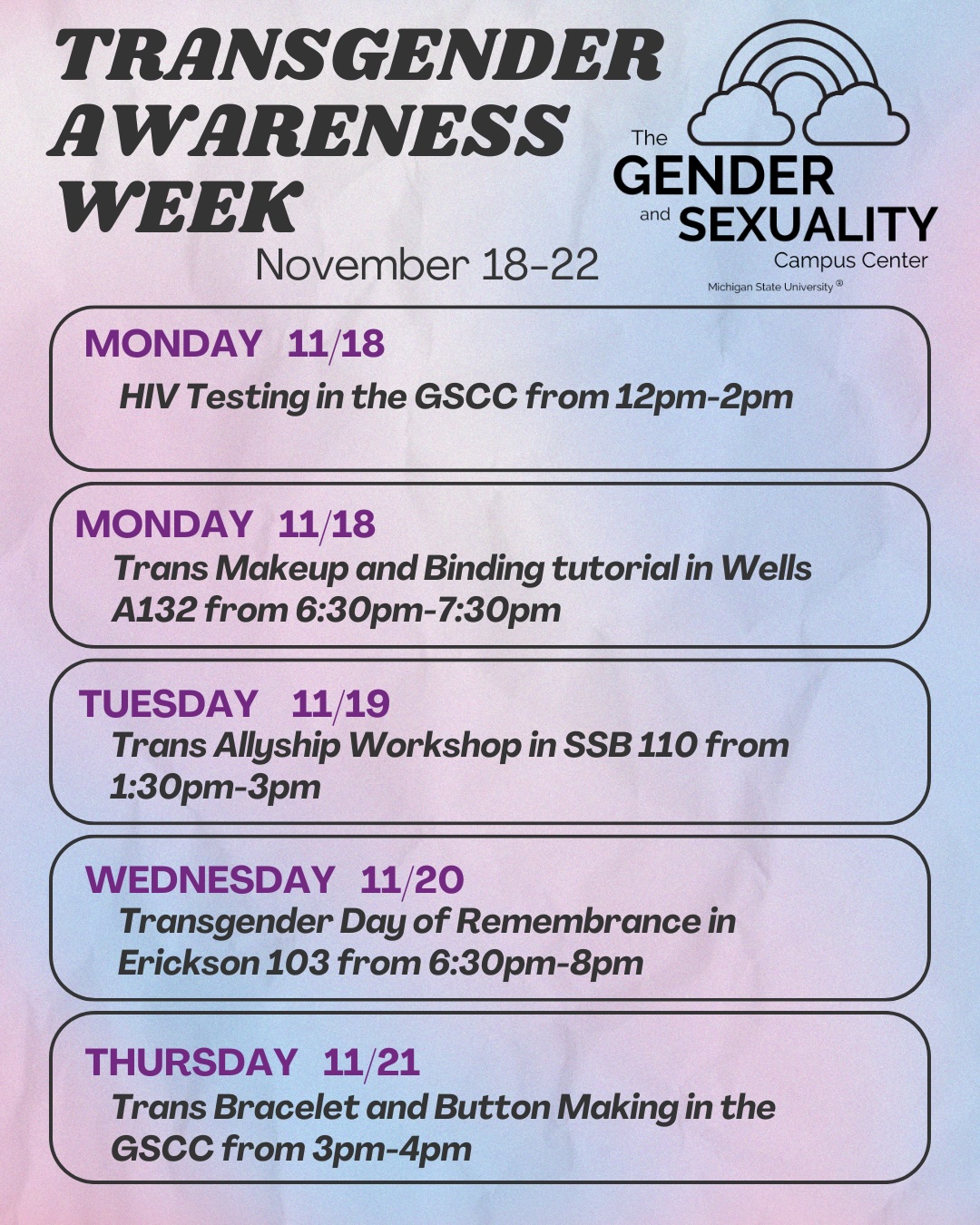 At Michigan State University, students, staff, faculty and community members can gather and connect for TDOR events hosted by the MSU Gender and Sexuality Campus Center, or GSCC, from Nov. 18 to 22, including:
