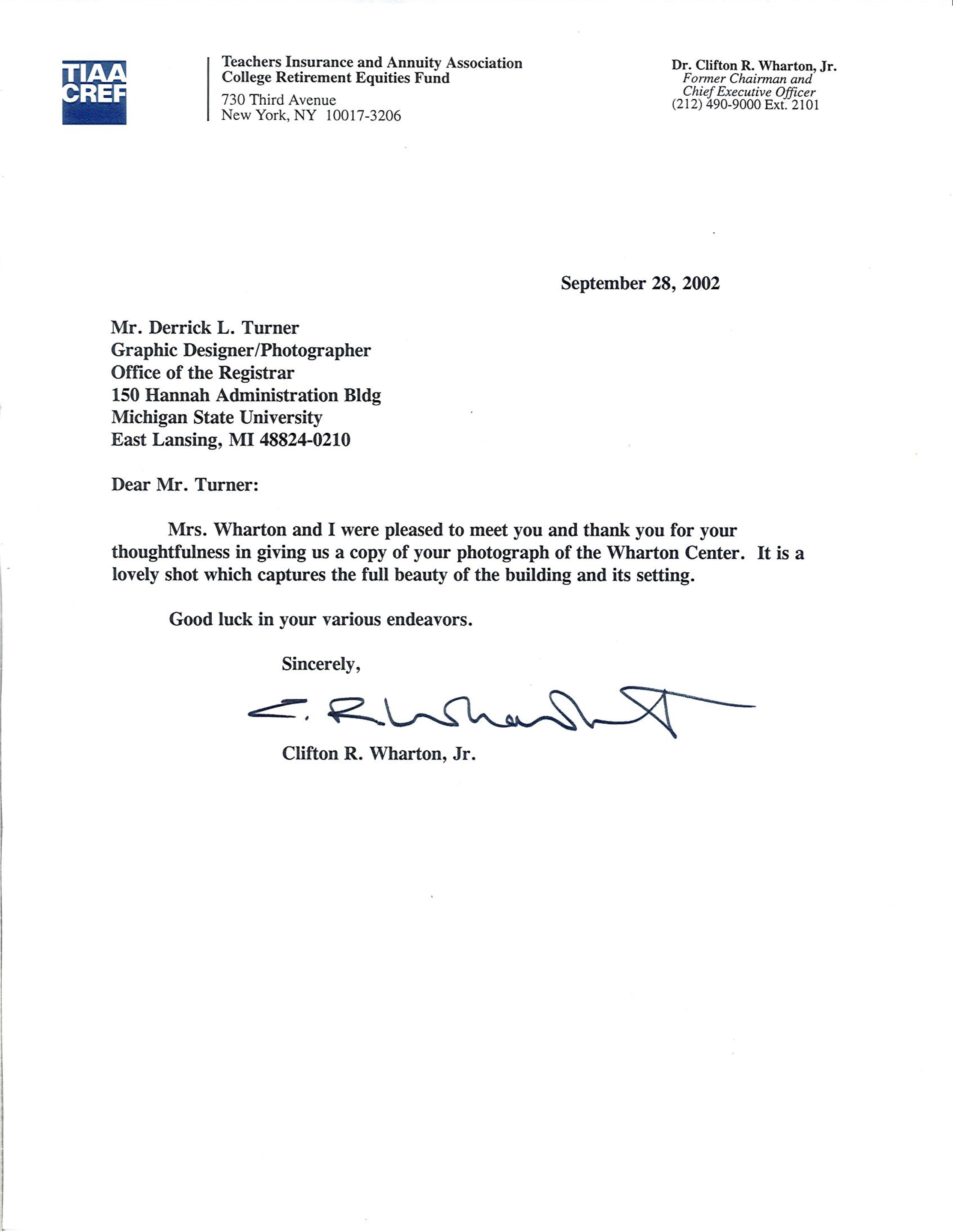 In 2015, I was fortunate to photograph Dr. Wharton’s return to campus after the publication of his autobiography, “Privilege and Prejudice: The Life of a Black Pioneer.” I took the opportunity to let him know I still had that thank-you note on TIAA-CREF letterhead.