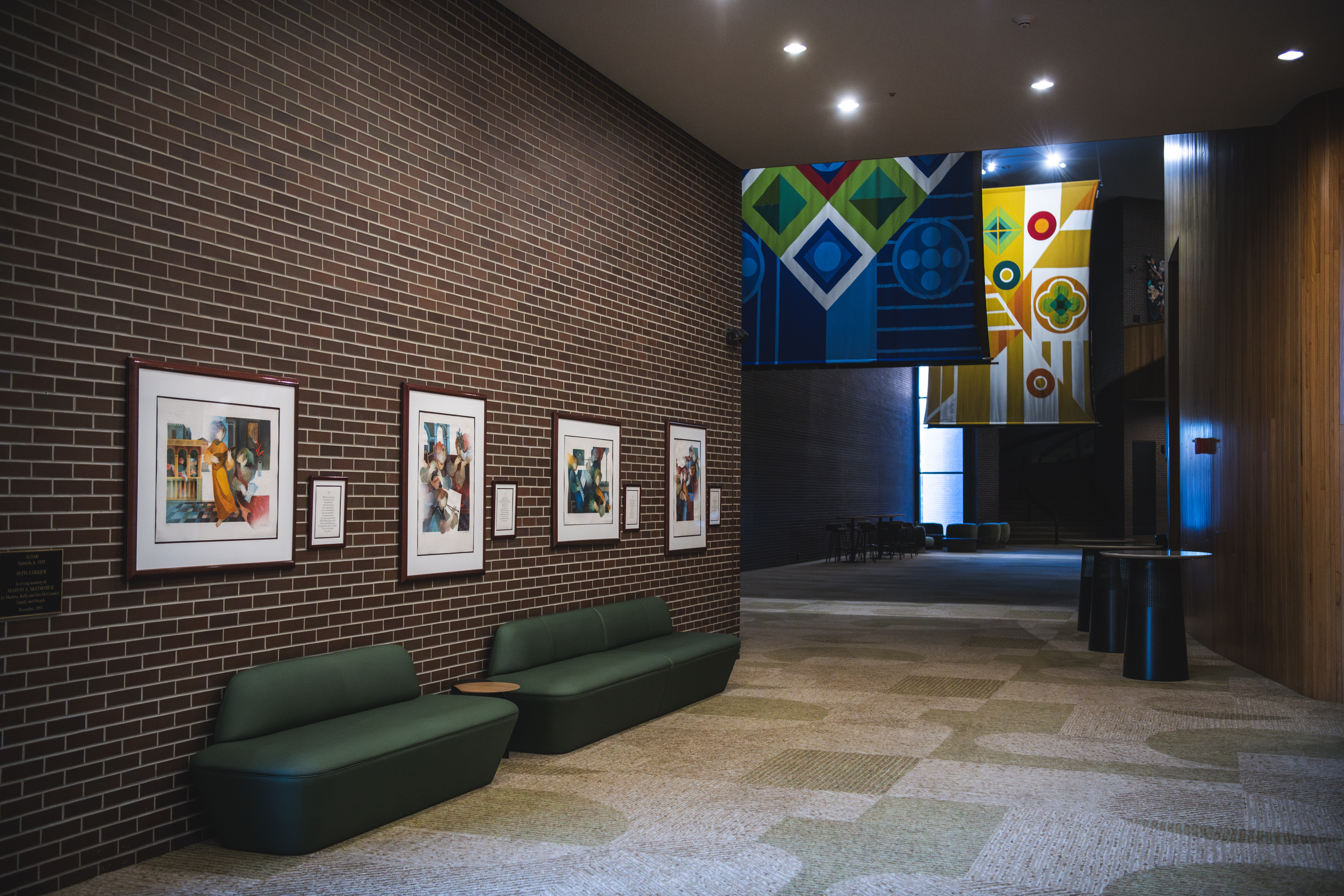 A standout feature of the renovation is the new custom-designed carpet, which draws inspiration from The Four Muses banners displayed in the Cobb Great Hall Lobby since 1982. Created by George Ortman and commissioned by the Cobb Family, the banners represent the four muses of the arts: Euterpe (Muse of Music in blue, green, and white), Calliope (Muse of Poetry in green), Thalia (Muse of Comedy in blue and red) and Terpsichore (Muse of Dance in yellow). Their colors and shapes have been woven into the new carpet as well as the inspiration for the new wall covering in the Pasant Theatre, blending Wharton Center’s history with a fresh new look.