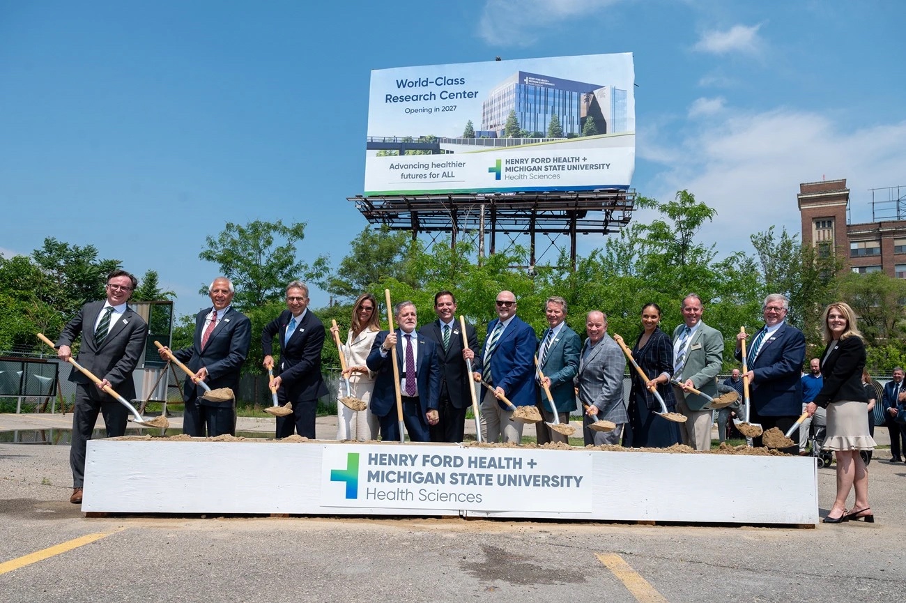 Leaders from Henry Ford Health and Michigan State University kick off the Henry Ford Health + MSU Health Sciences Research Center groundbreaking in June 2024. Photo by Derrick L. Turner.