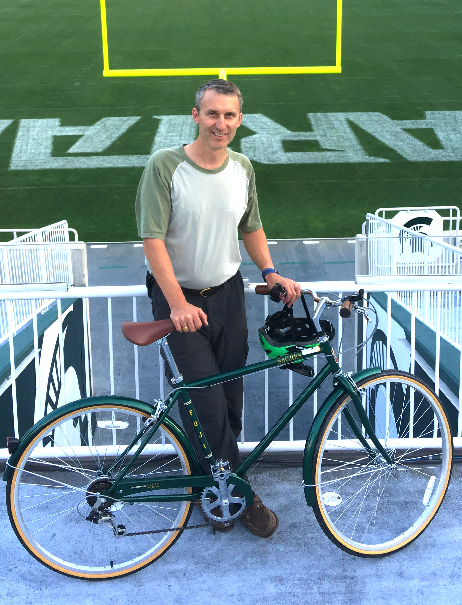 Tim Potter is the sustainable transportation manager for the MSU Bikes Service Center, and has spent the past 24 years with Michigan State University. He also serves as a member of the MSU Bikes Advisory Committee, as well as co-founder of the national Campus Bike Programmer’s Network. He also serves on the board of the international Ride of Silence board. A lifelong cyclist, Potter started tinkering with bikes as a 12-year-old. He has biked all over the United States, met his wife through bicycling and even working in the bicycle tourism industry in Japan.