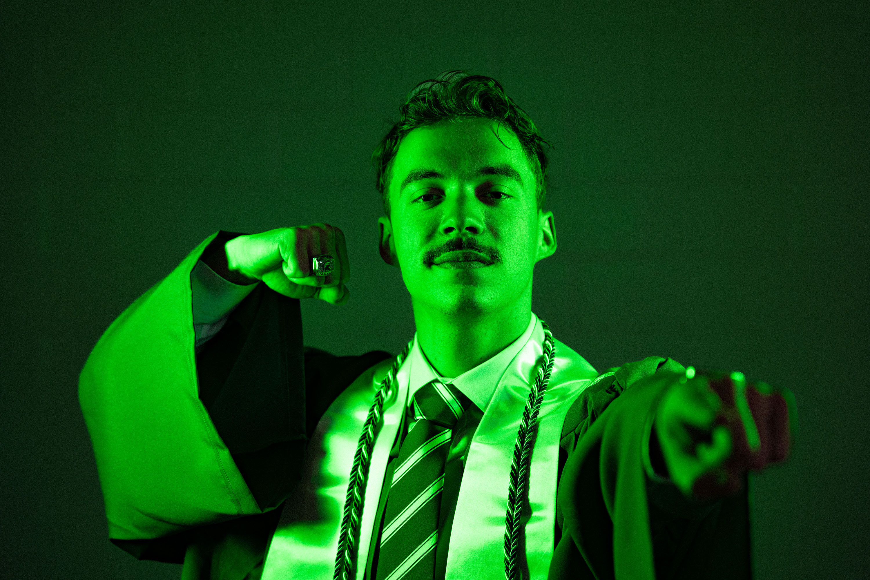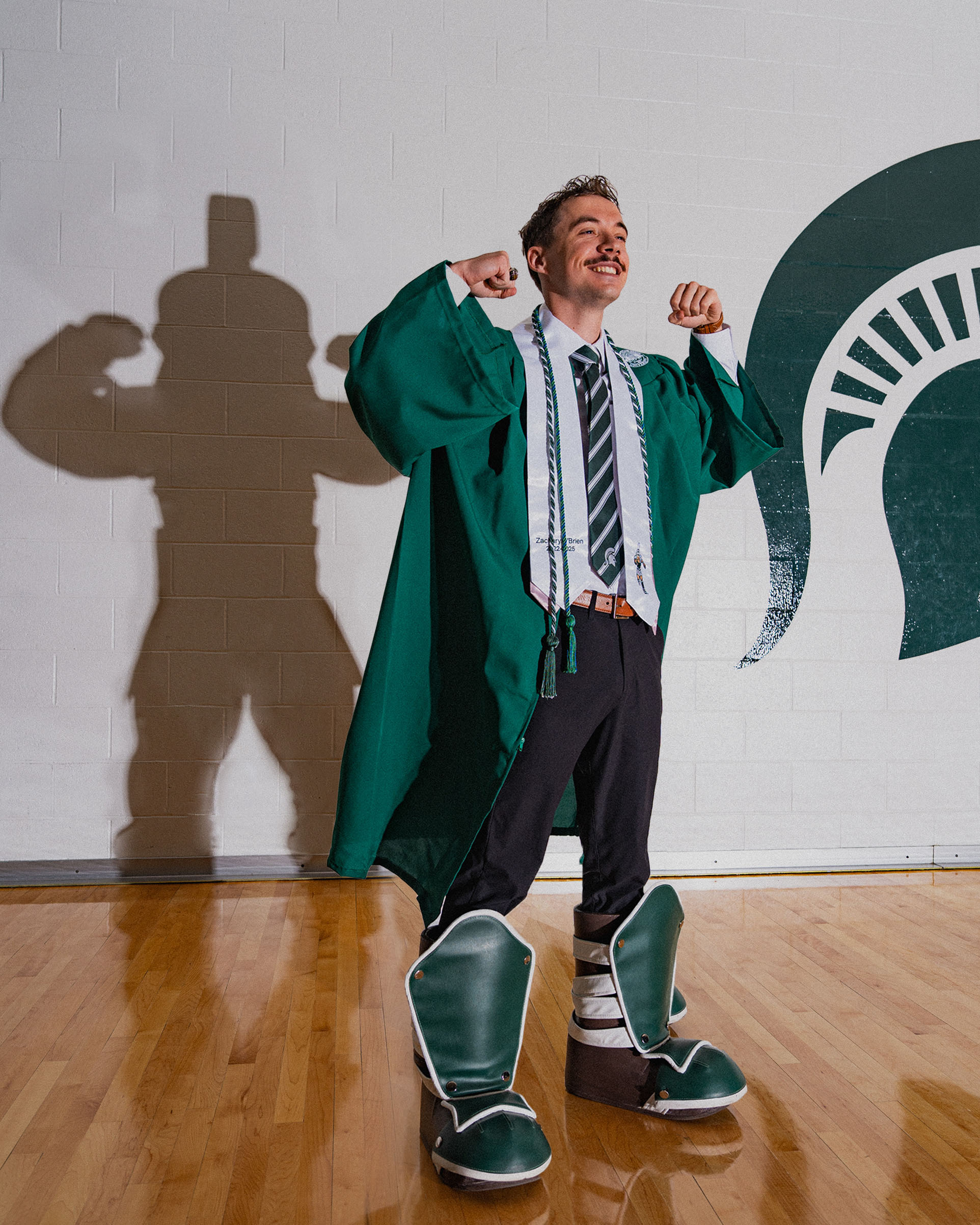 Zachary grew up watching Sparty sprint across the field, never imagining he’d one day be him. After transferring to MSU in 2022, a spontaneous application to the mascot program opened the door to a uniquely Spartan experience, filled with travel, traditions and the challenge of keeping a big secret. As he graduates from the College of Communication Arts and Sciences, Zach looks back on his time behind the mask and what it meant to represent Michigan State from the inside out.