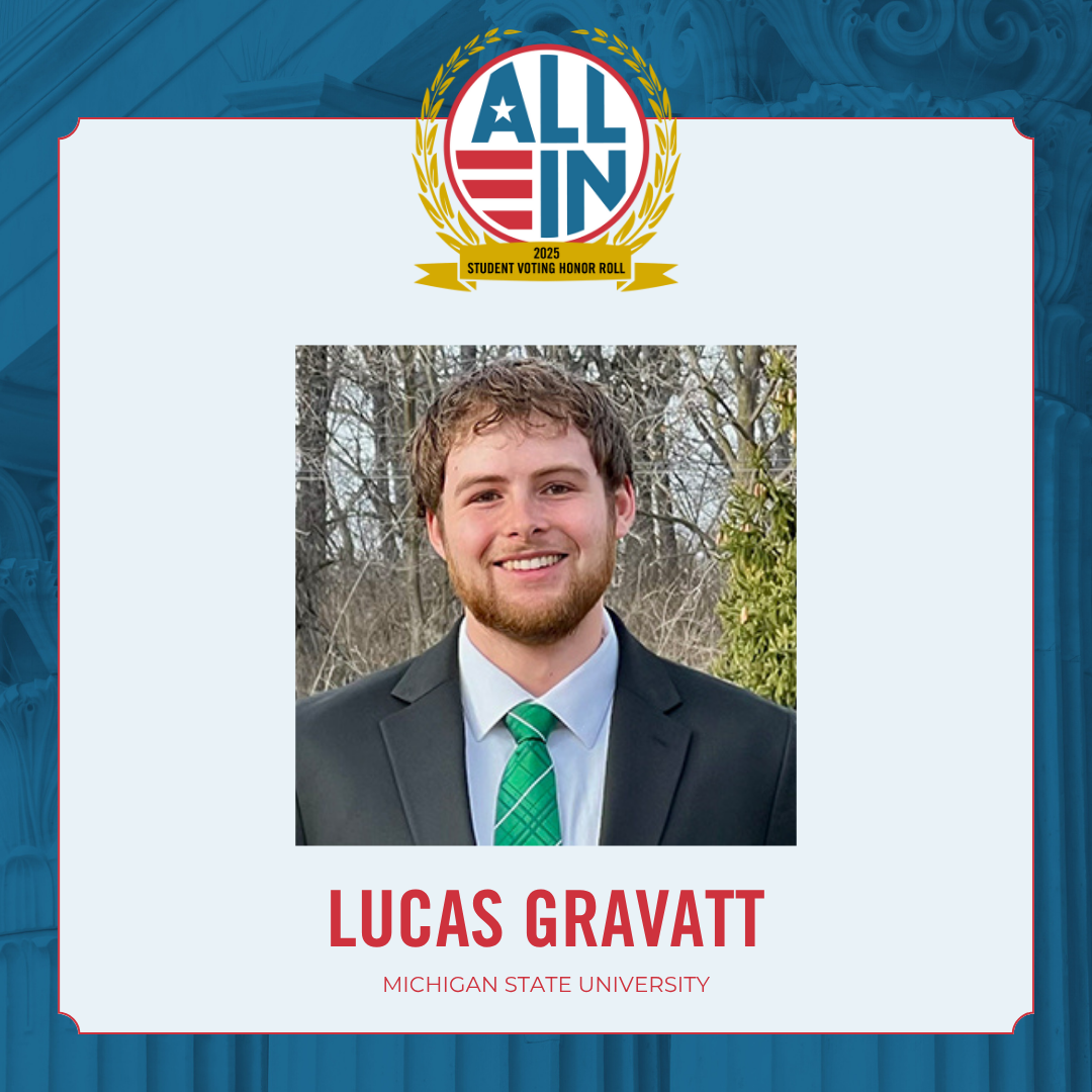 Lucas Gravatt, a recent MSU graduate, was named to the 2025 ALL IN Student Voting Honor Roll. The honor roll recognizes students who have contributed to the advancement of nonpartisan student voter registration, education, and turnout efforts in their communities. He is one of only 232 individuals named to the honor roll across the country.
