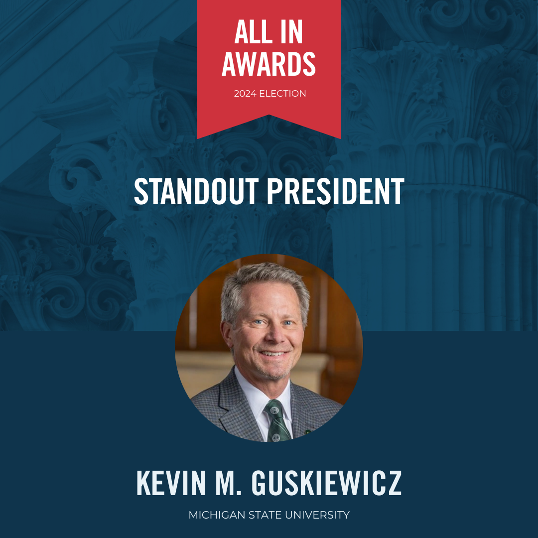 Michigan State University has a longstanding commitment to promoting nonpartisan democratic engagement on campus, particularly through initiatives focused on voter registration and turnout. This dedication was recently recognized by the ALL IN Campus Democracy Challenge, which honored MSU President Kevin M. Guskiewicz, Ph.D., and student Lucas Gravatt. ALL IN is a national initiative of Civic Nation, an organization dedicated to building a more inclusive and equitable country by collectively addressing social challenges.