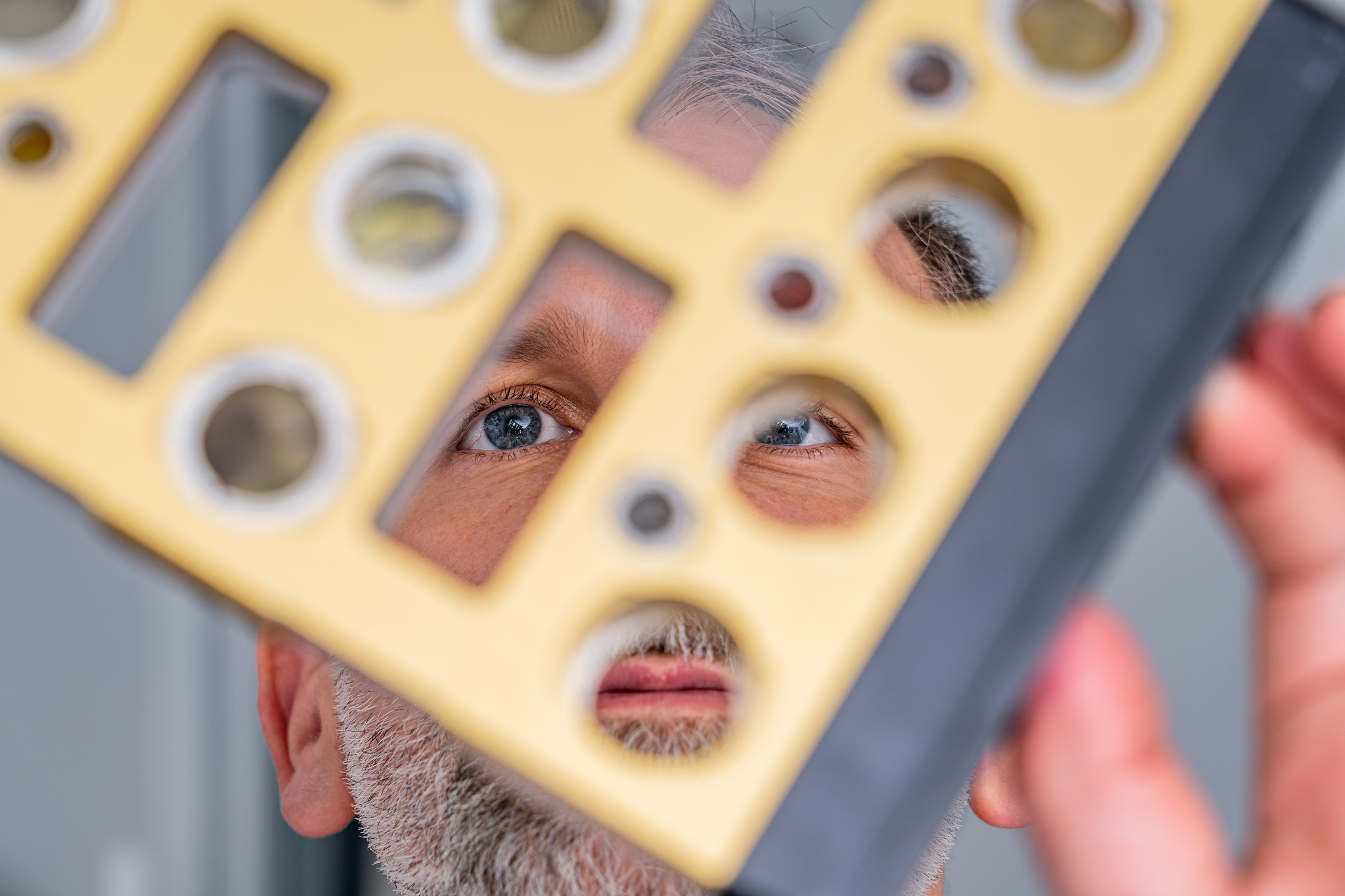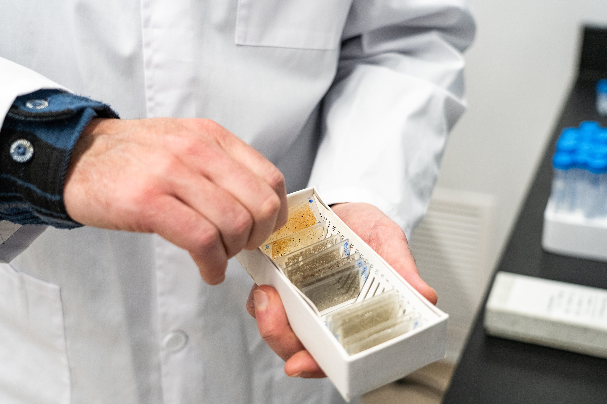 Another option is to slice into the rock like a piece of cake to examine the layers. The slices are so thin they’re transparent, about the width of a hair. Crystals hiding inside the rock are visible in those slices, making their composition ripe for analysis.